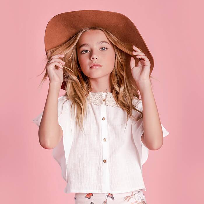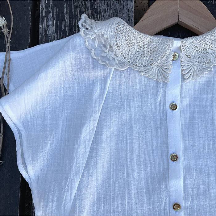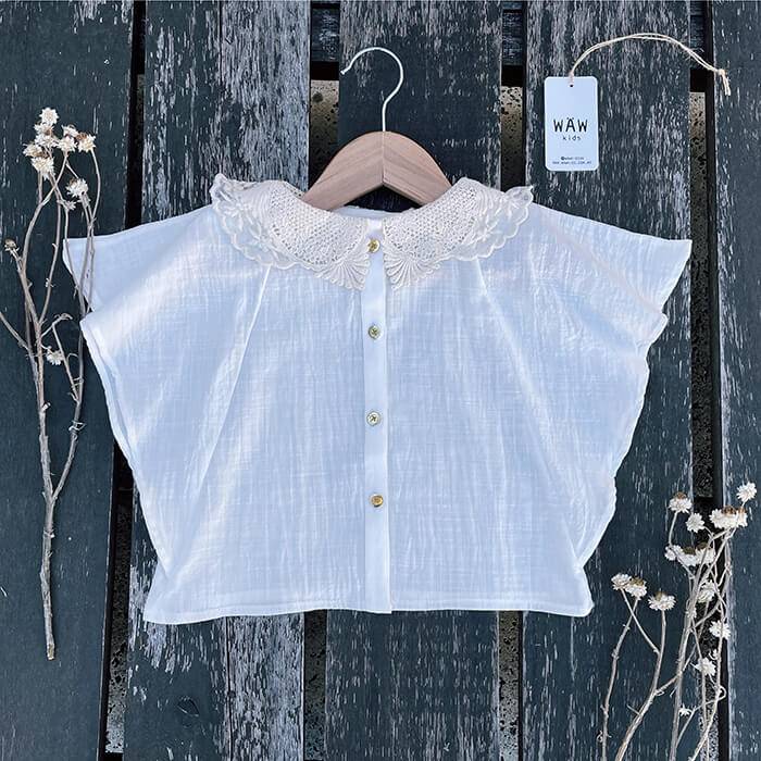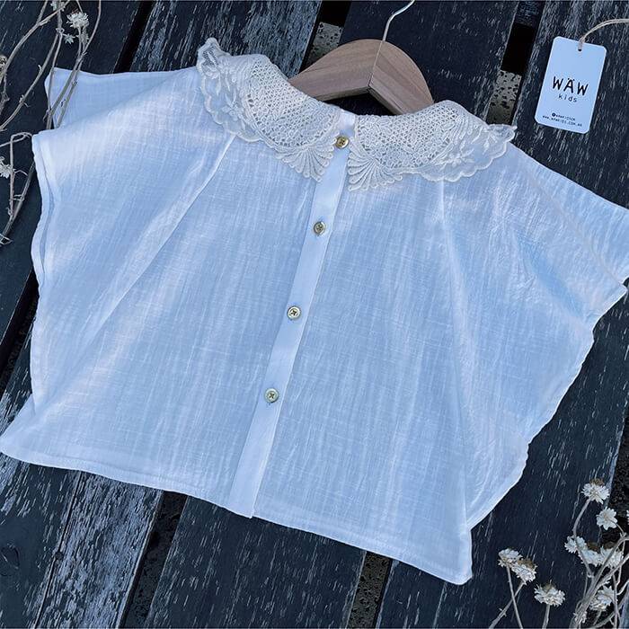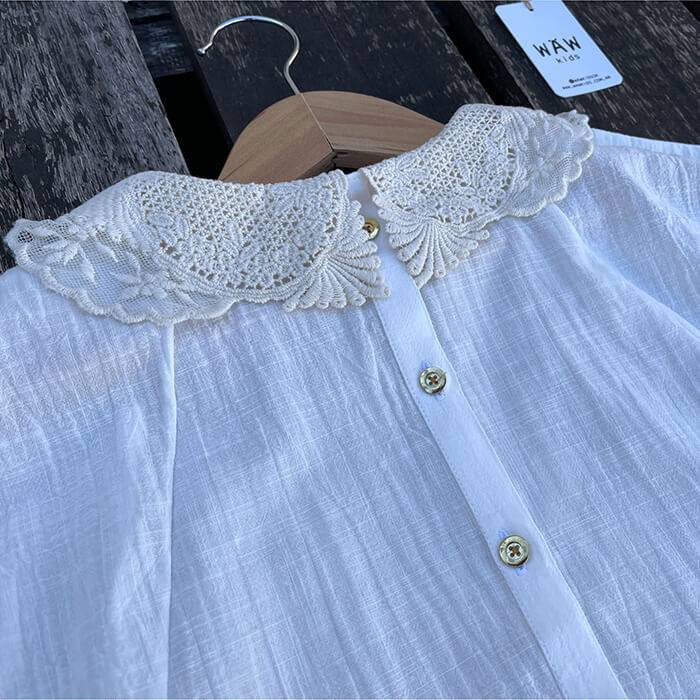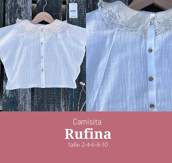 Camisita Rufina, de genero importado con textura, cuello de macrame y tul importado, ojal y botones de metal color oro.