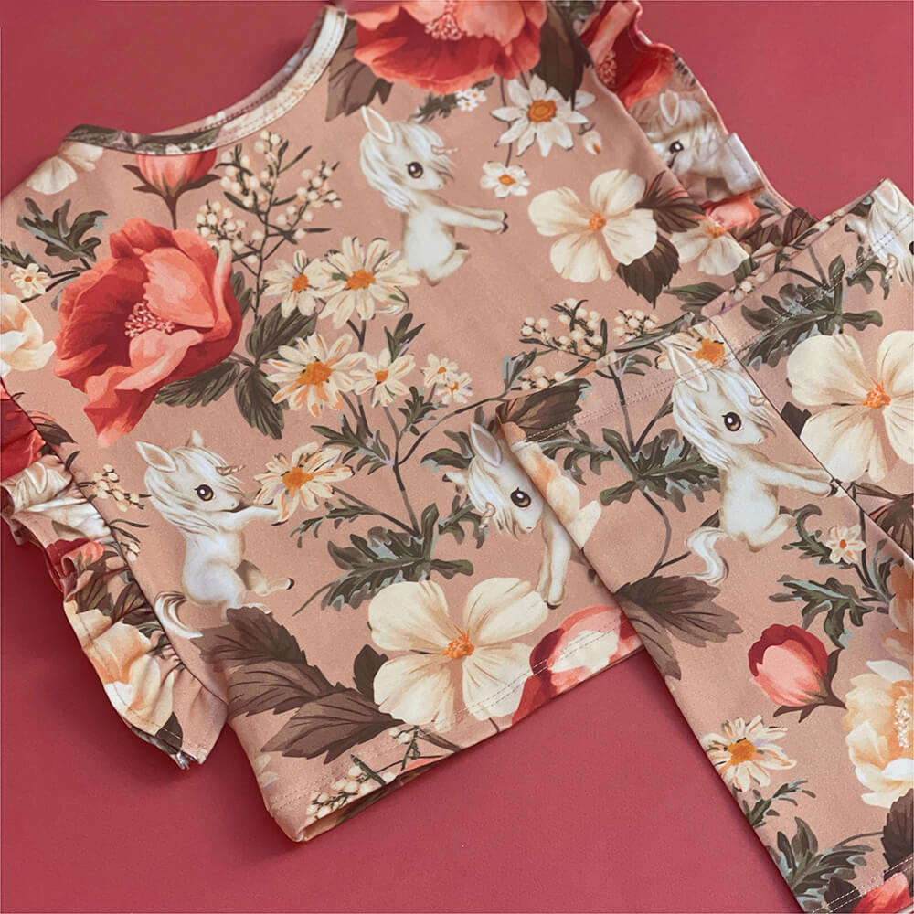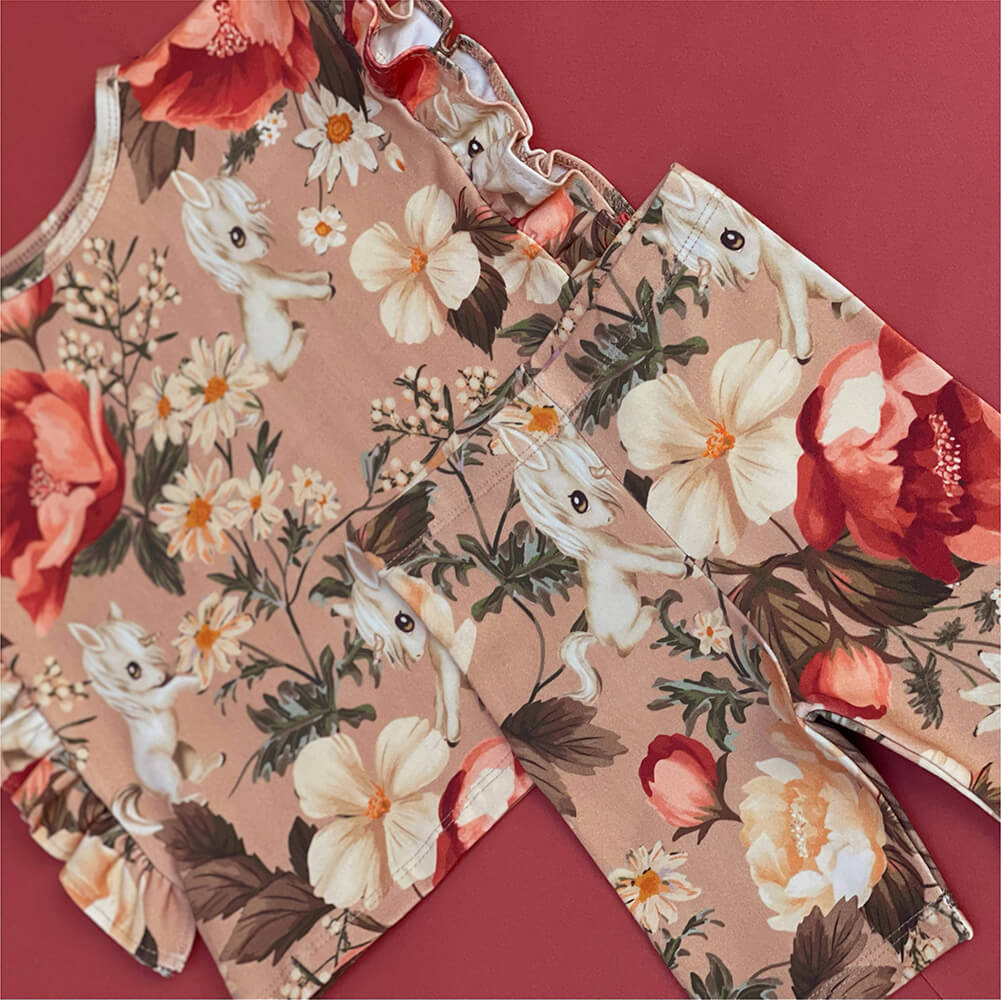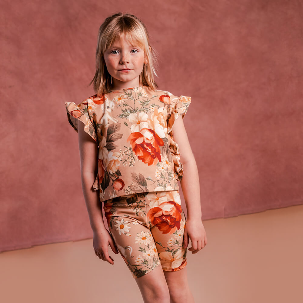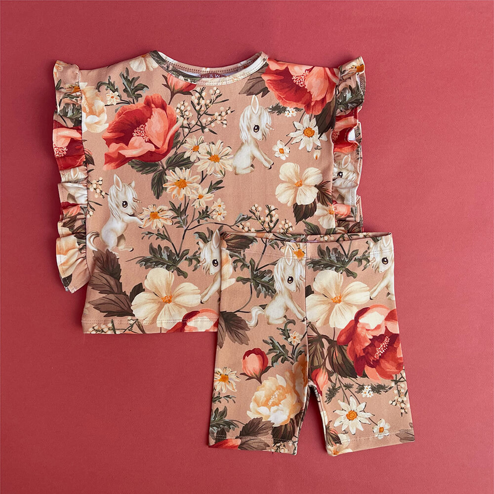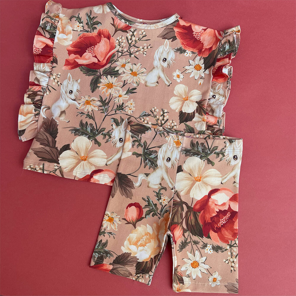 Conjunto de algodon con lycra con estampado exclusivo, recorte en cintura y frunces de blusita, espalda con escote y terminacion anudada. Bikers corte clasico, tela elastizada.