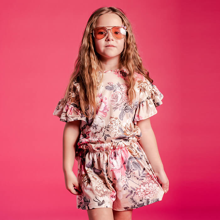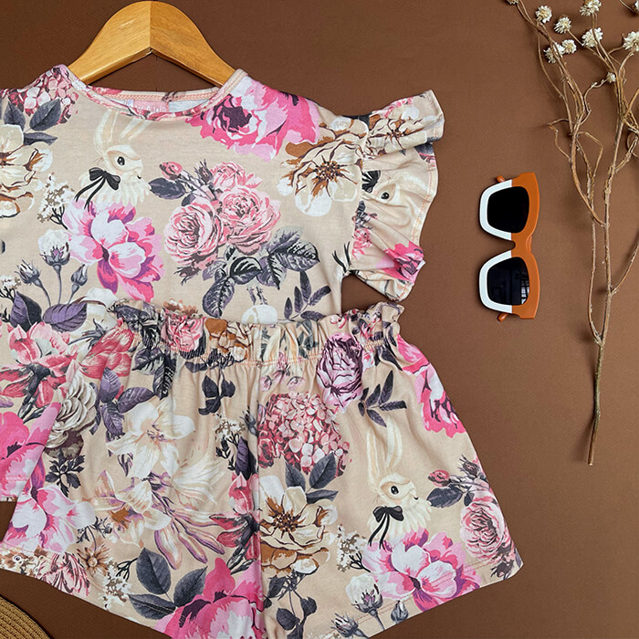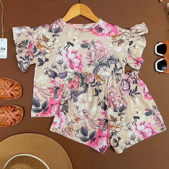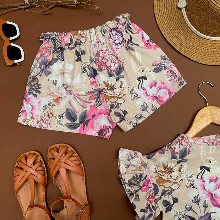 Conjunto de jersey estampado exclusivo, remera con manga fluida y volados, escote redondo, y short a tono con elastico y volado en cintura.
