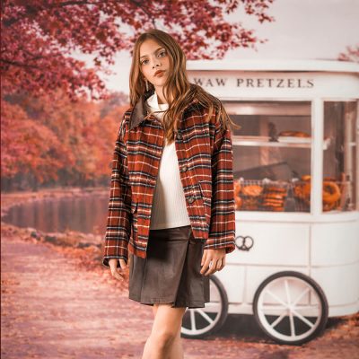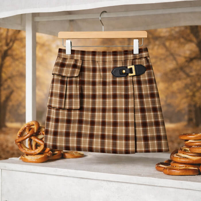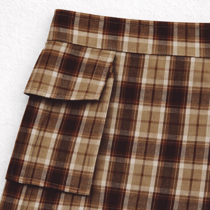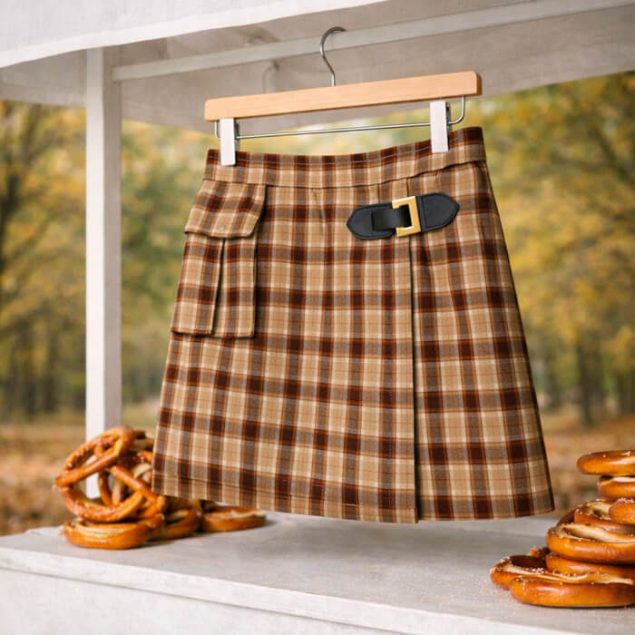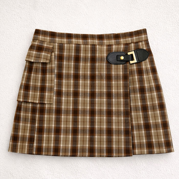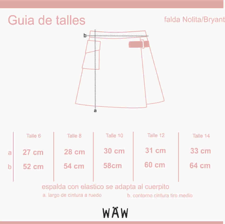 Falda Viyela hilo color cuadrille, con tapa cruzada y detalle de hebilla en cuerina y metal color plata. tiene elastico en cintura para mejor adaptacion al cuerpito.